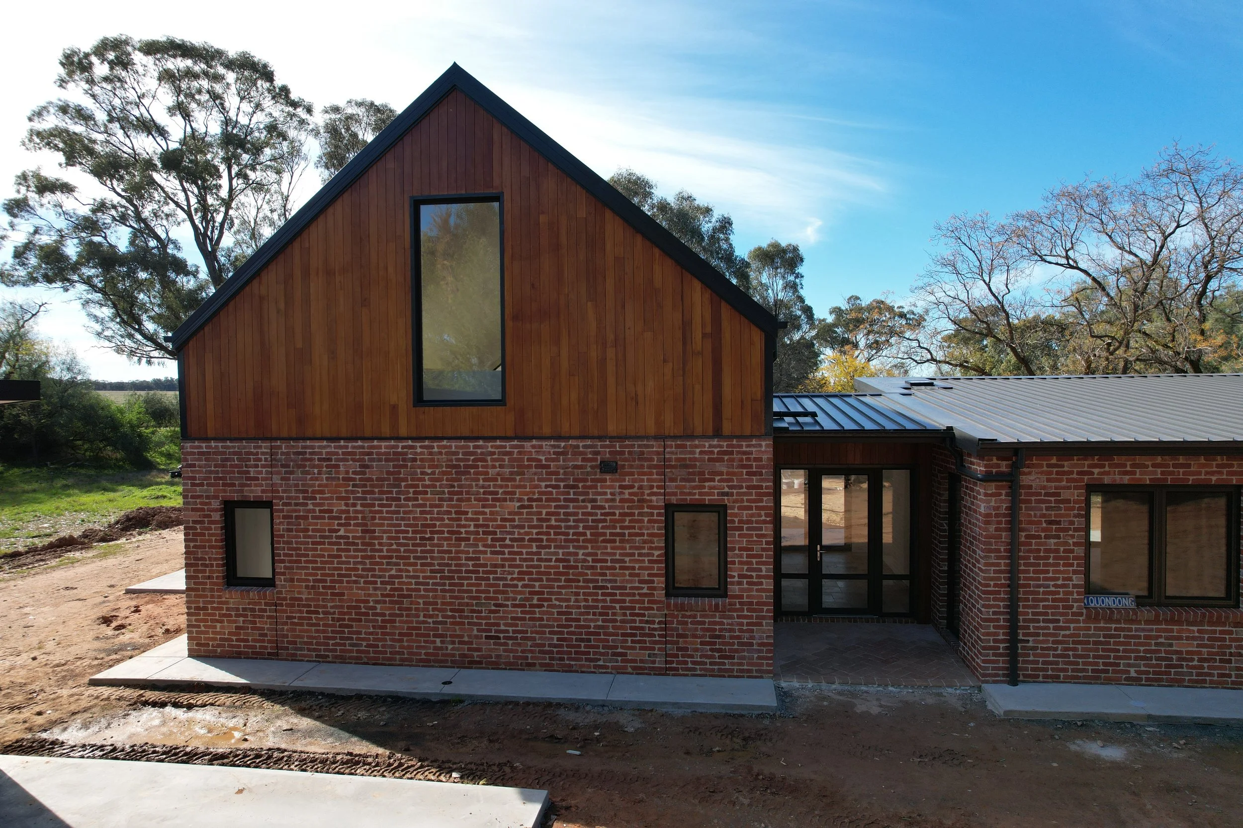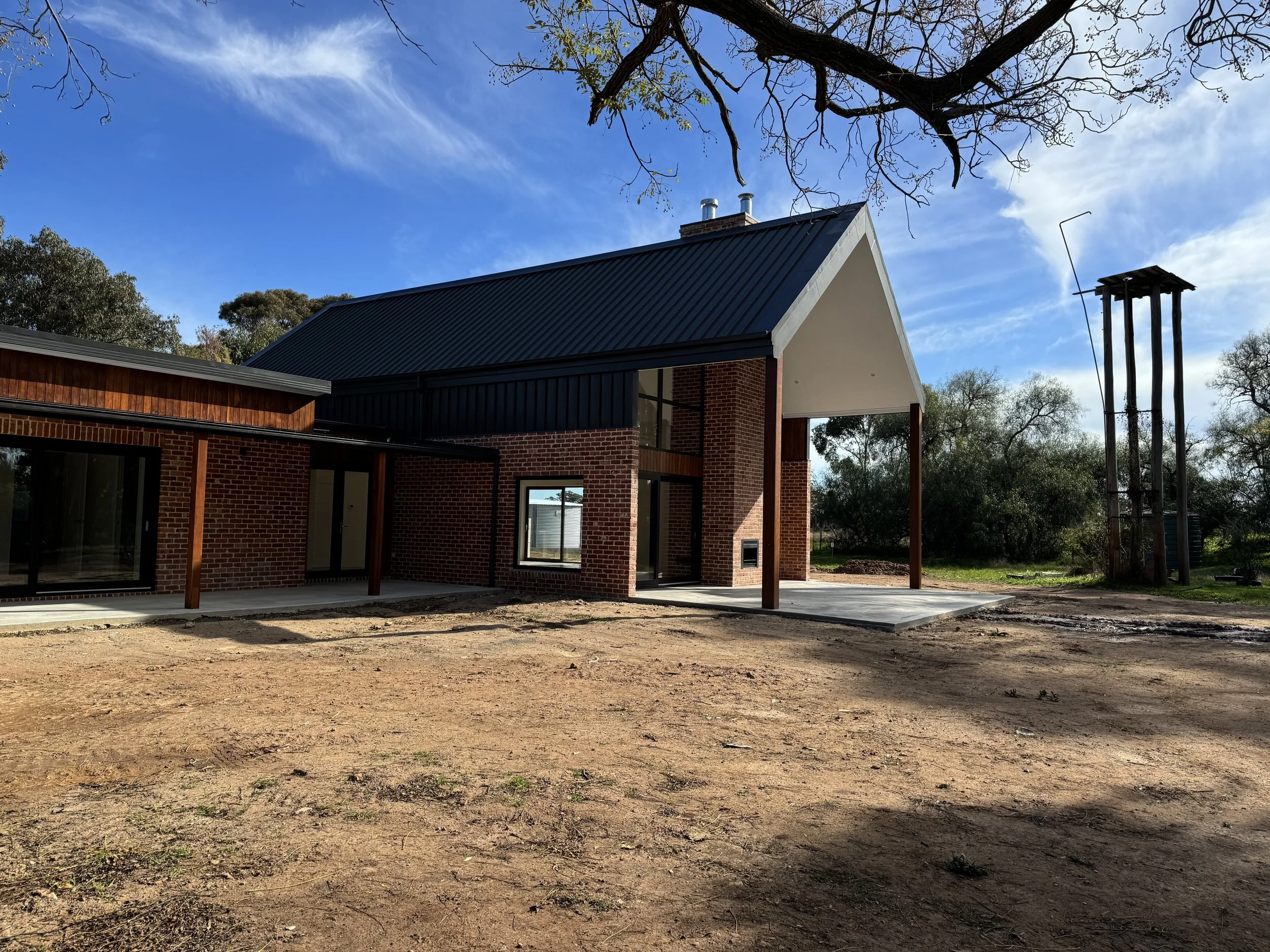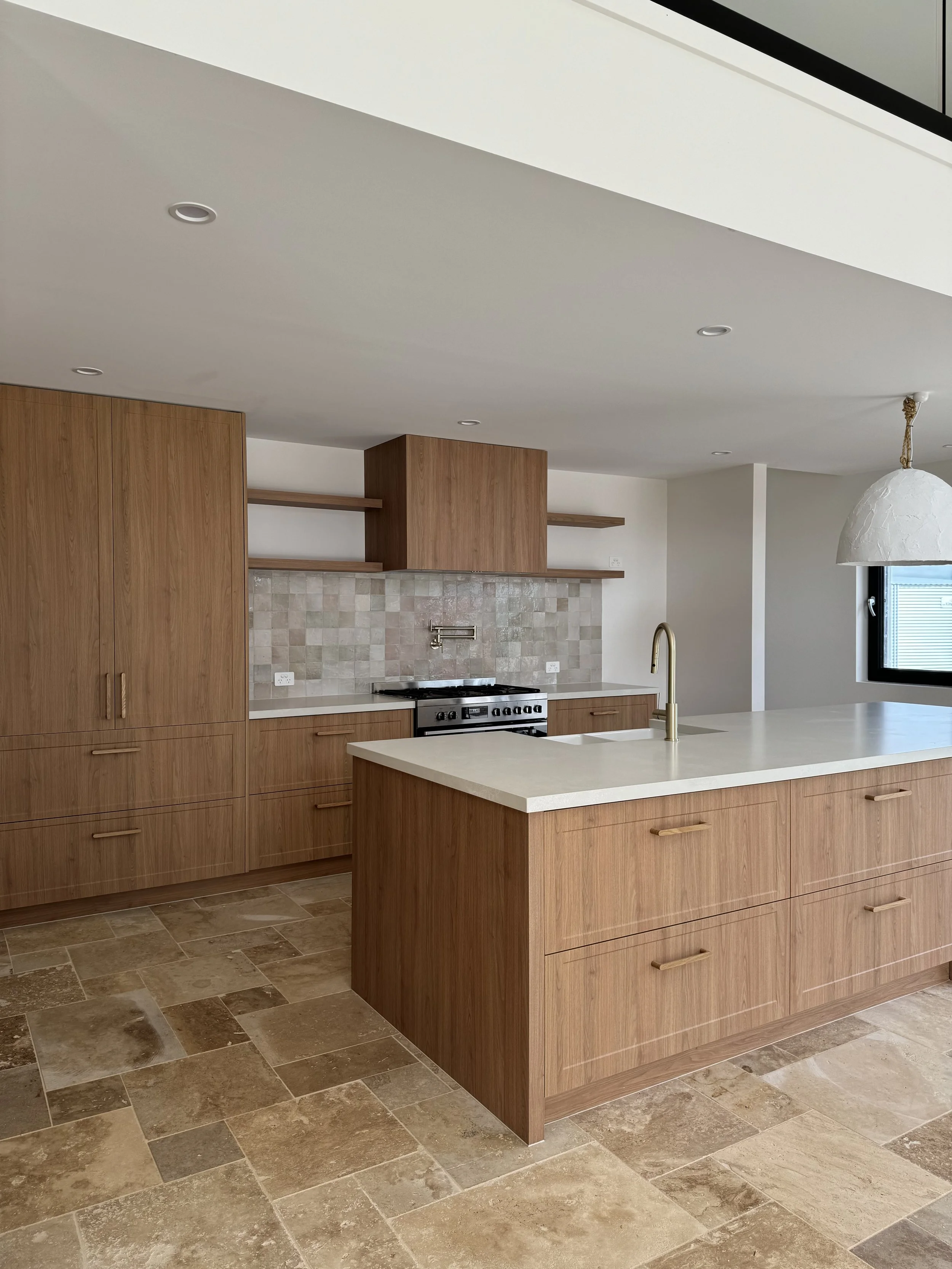 Our recent custom build at Quandong Lane highlights our expertise! A detached garage, 7.6m high pitched roof with mezzanine above the kitchen, French pattern travertine pavers throughout the main area and hallway, enseam cladding roof and walls, as well as timber cladding and a veranda halfway around the house.