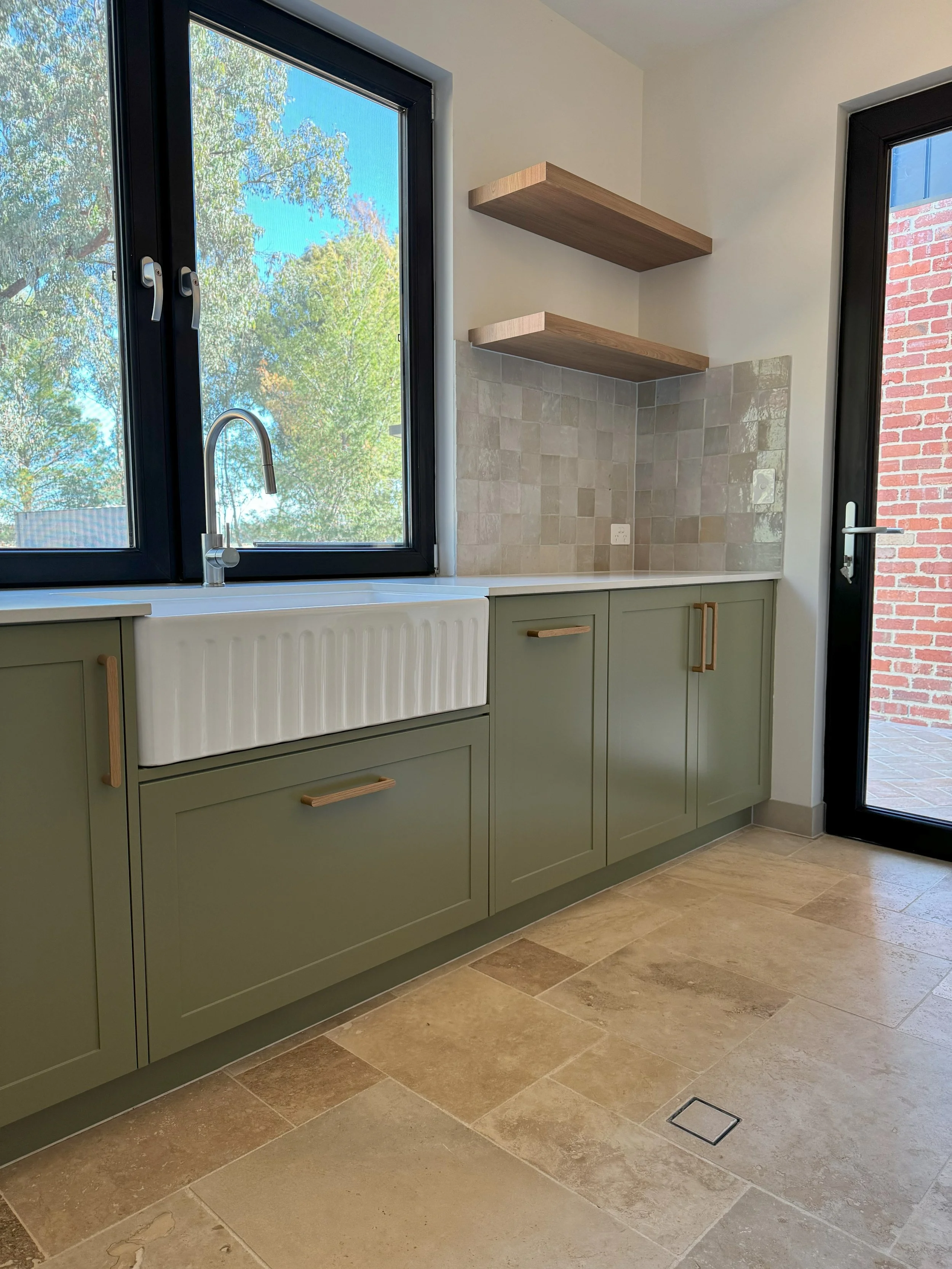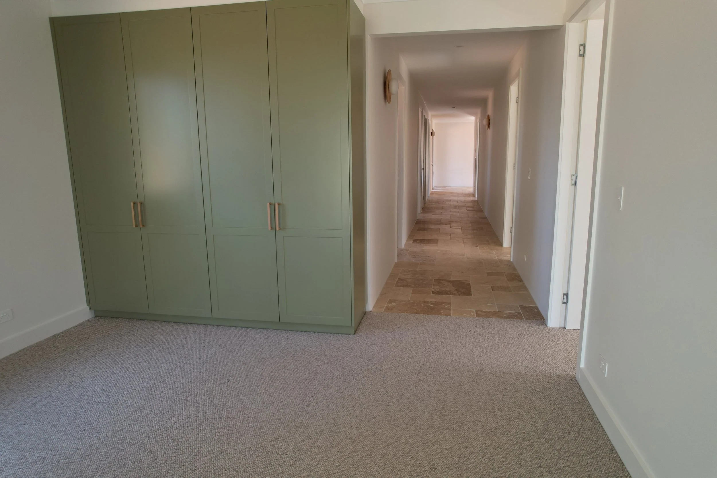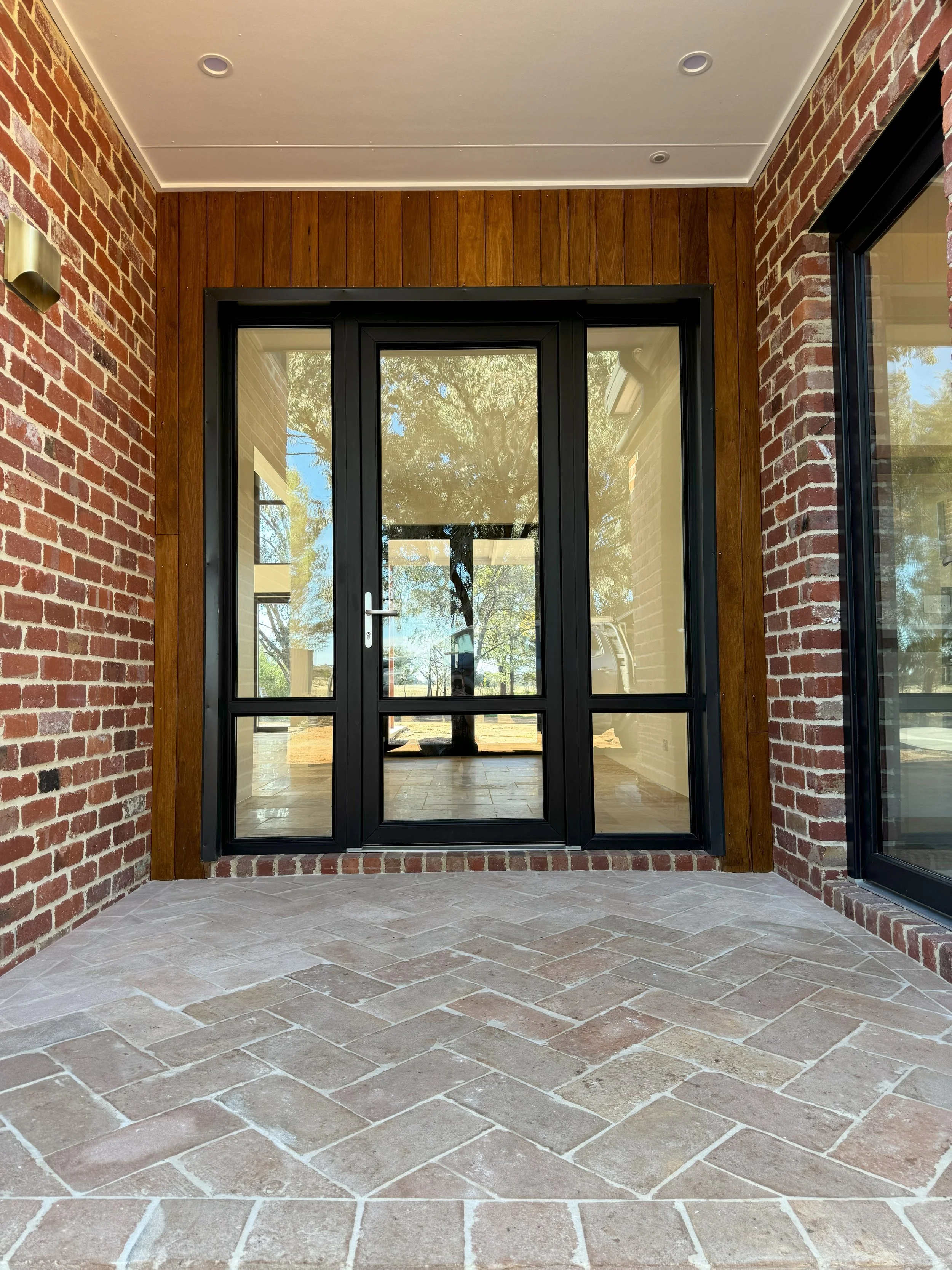 Our recent custom build at Quandong Lane highlights our expertise! A detached garage, 7.6m high pitched roof with mezzanine above the kitchen, French pattern travertine pavers throughout the main area and hallway, enseam cladding roof and walls, as well as timber cladding and a veranda halfway around the house.